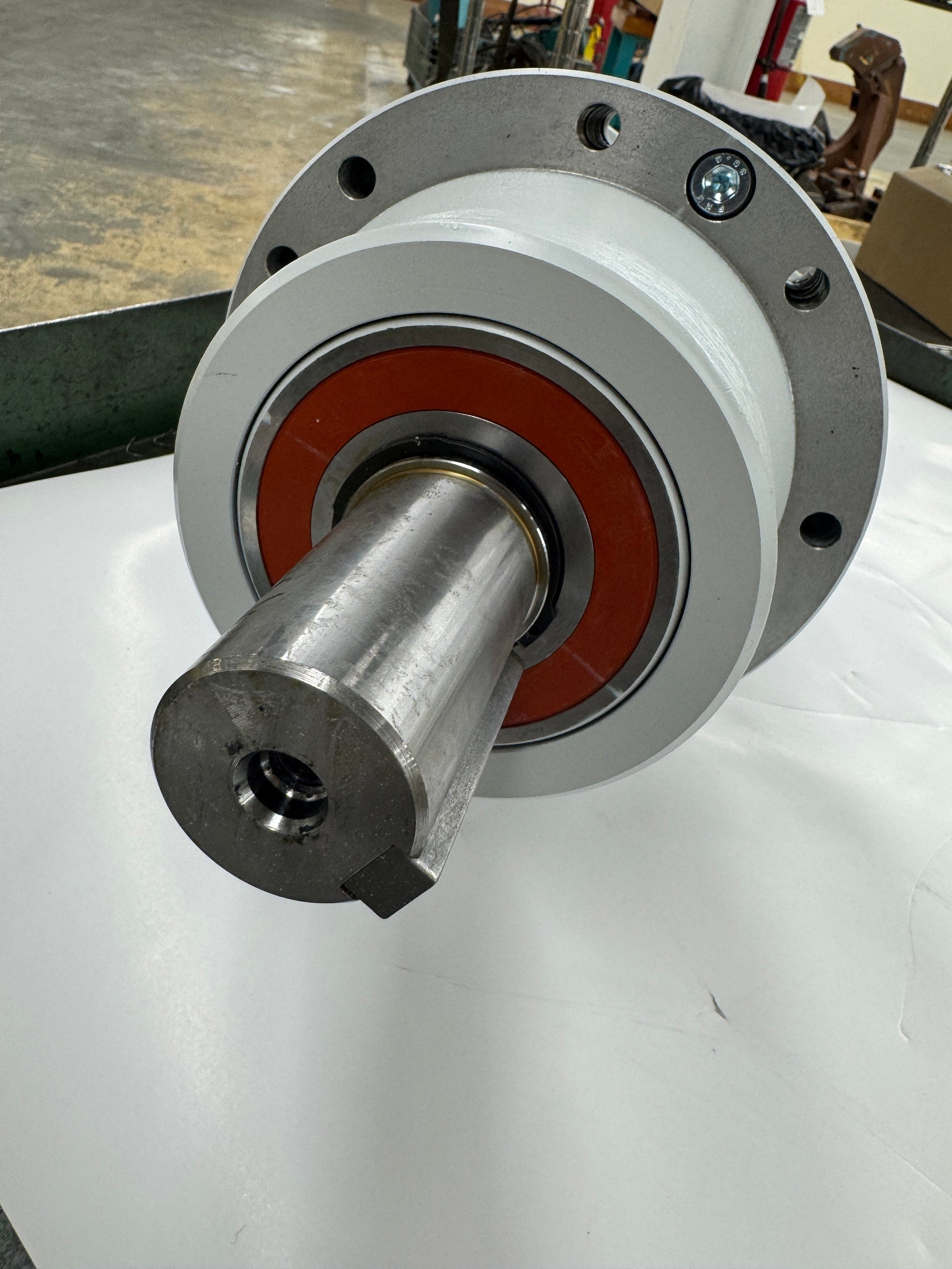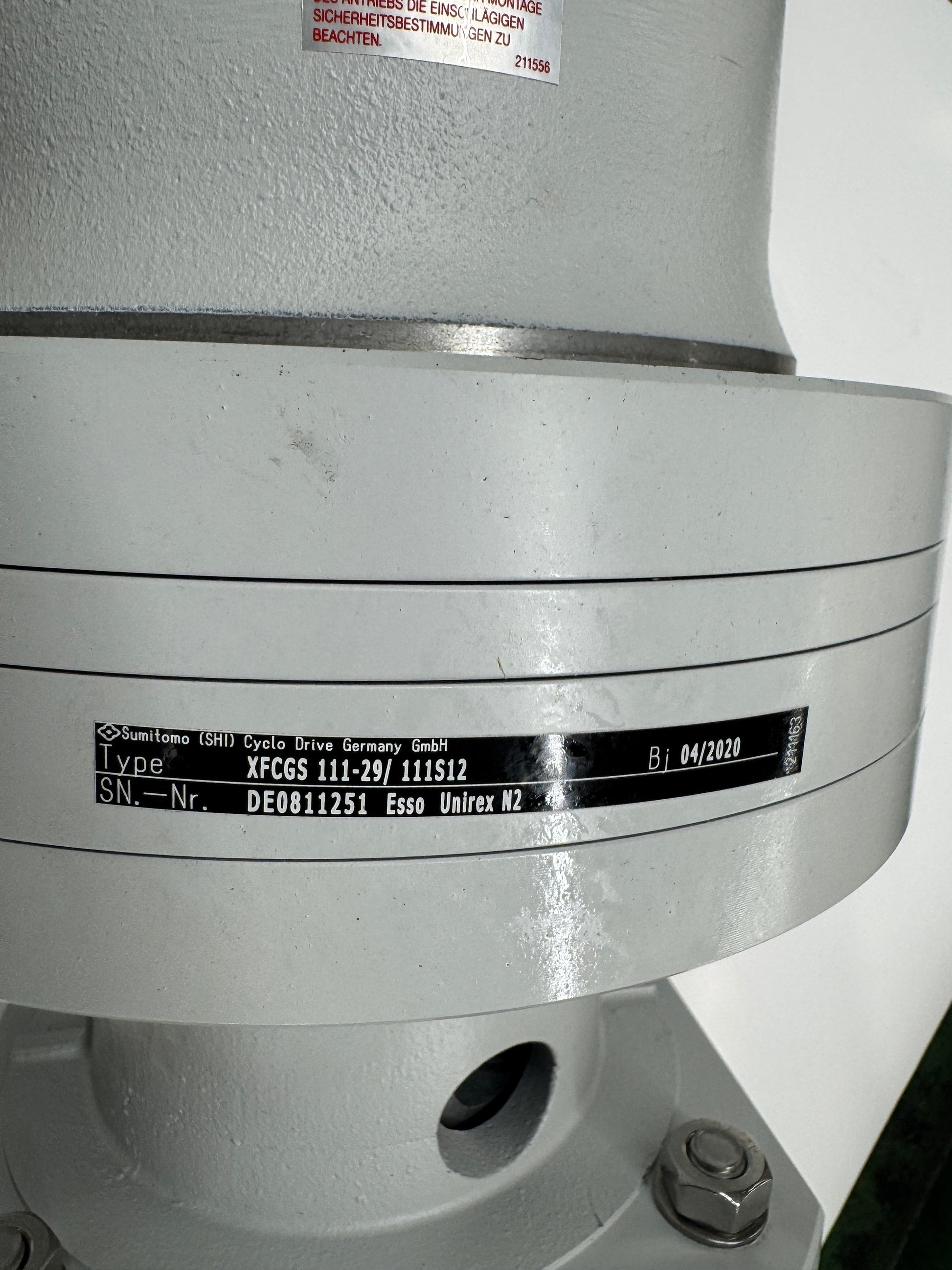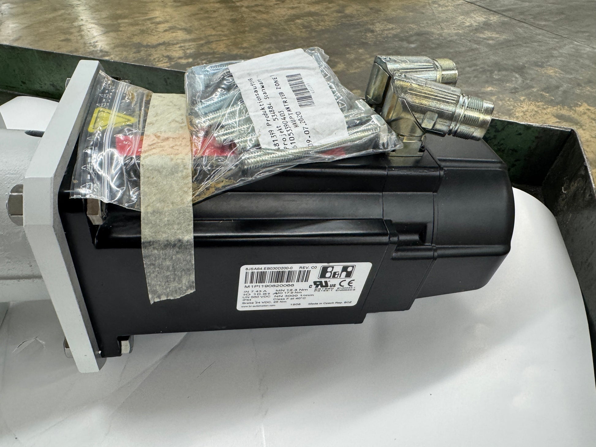 The B&R 8JSA64.EB030D200-0 is a three-phase synchronous servo motor from B&R Automation, assembled with a Sumitomo (SHI) Cyclo Drive Germany GmbH XFCGS 111-29/111S12 inline Cyclo servo gearhead forming a complete servo gearmotor unit. The motor nameplate shows a rated current of 7.43 A, peak current of 10.81 A, rated DC link voltage of 560 VDC, nominal torque of 12.3 Nm, peak torque of 17.9 Nm, rated speed of 3000 RPM, IP54 protection class, Class F insulation at 40 degrees C, and a 24 VDC holding brake rated at 25 Nm. Serial number M1PI190820066, revision C0, manufactured August 2019 in Czech Republic. Certifications include UL, CE, EN60034-1, and EN60034-5. The Sumitomo XFCGS 111-29/111S12 gearhead is a size 111 inline Cyclo Servo 100 series reducer with a 29:1 gear ratio, serial number DE0811251, manufactured April 2020. This is the largest size in the XFCGS Servo 100 series, rated for output torques up to 500 Nm, with lifetime grease lubrication and mechanical backlash under 3 arcmin. Lubricated with Esso Unirex N2. The output shaft is a solid keyed shaft. Hardware bag with mounting fasteners is included. Motor connector inserts and output shaft key drive components are visible. Compatible with B&R ACOPOS servo drive systems. Suitable for motion control, automation, and machine building applications requiring high torque at reduced output speed.