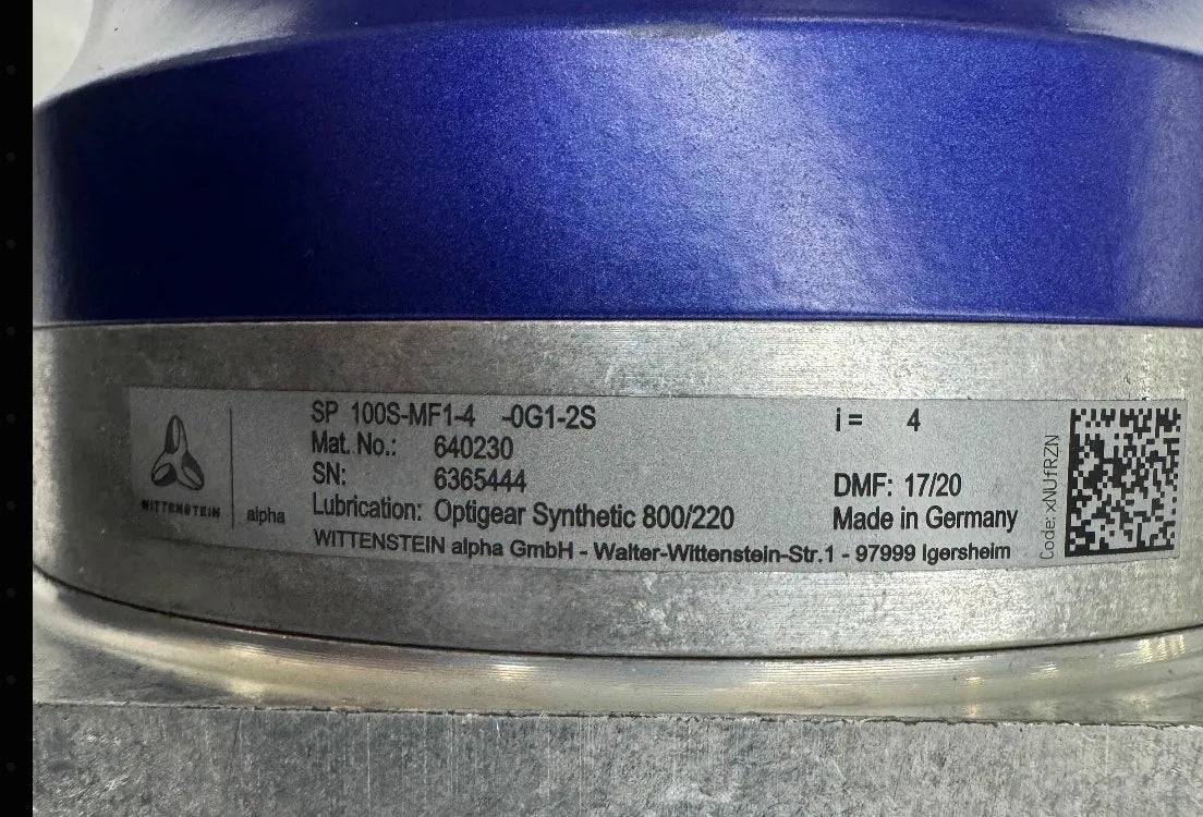 The WITTENSTEIN alpha SP 100S-MF1-4-0G1-2S gearbox provides a 4:1 single-stage inline reduction. Material number 640230, serial number 6365444. Date of manufacture is 17/20 (week 17, year 2020). Specified lubrication is Optigear Synthetic 800/220. The gearbox is manufactured by WITTENSTEIN alpha GmbH, Igersheim, Germany. WITTENSTEIN alpha is a premium-tier German manufacturer of precision planetary gearboxes widely specified in servo and robotics applications.
